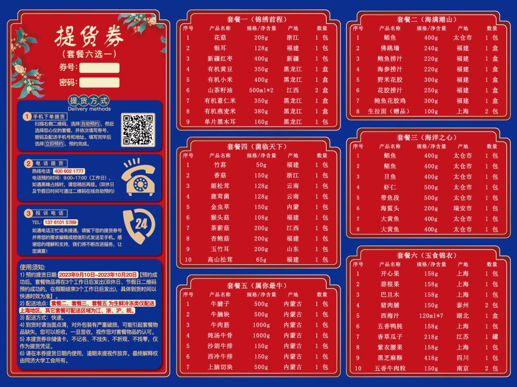 本次福利礼盒依旧延续往年做法,提供6种套餐(包括零食、干货、牛肉和海鲜的不同组合),充分满足教职工多元需求,教职工可通过扫描二维码、拨打预约电话等多种方式直接预约兑换。以此为广大教职工送上学校的关心和节日的祝福。