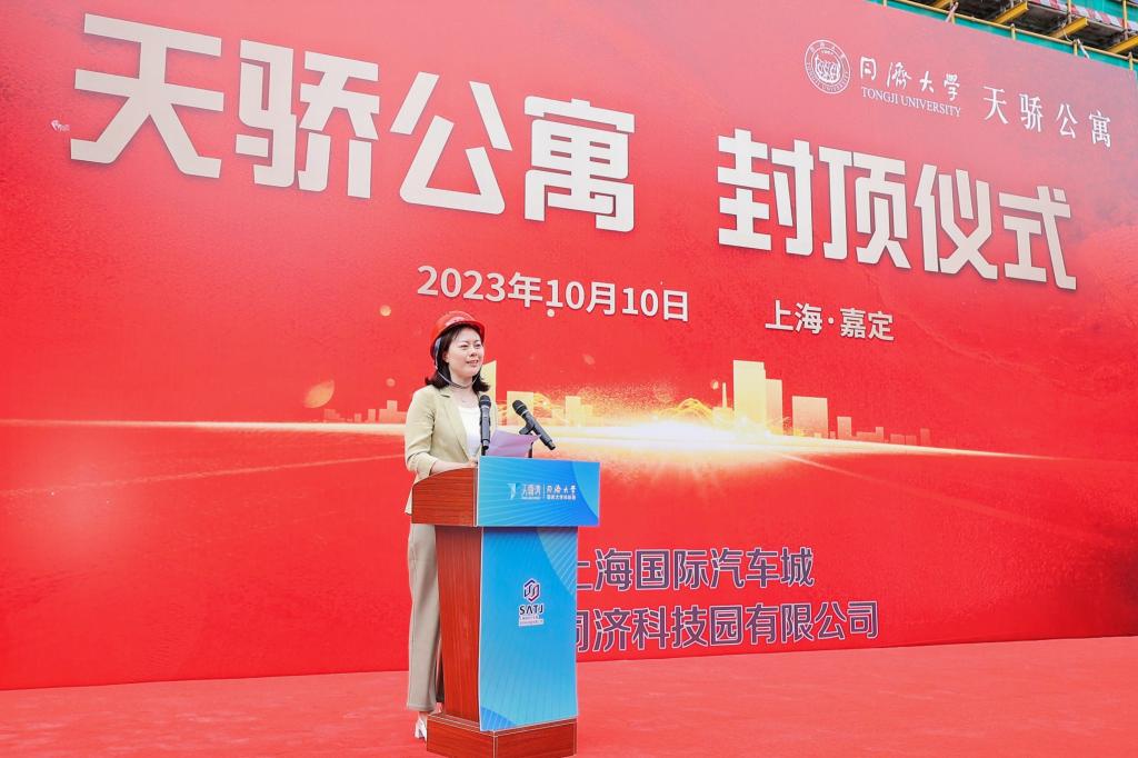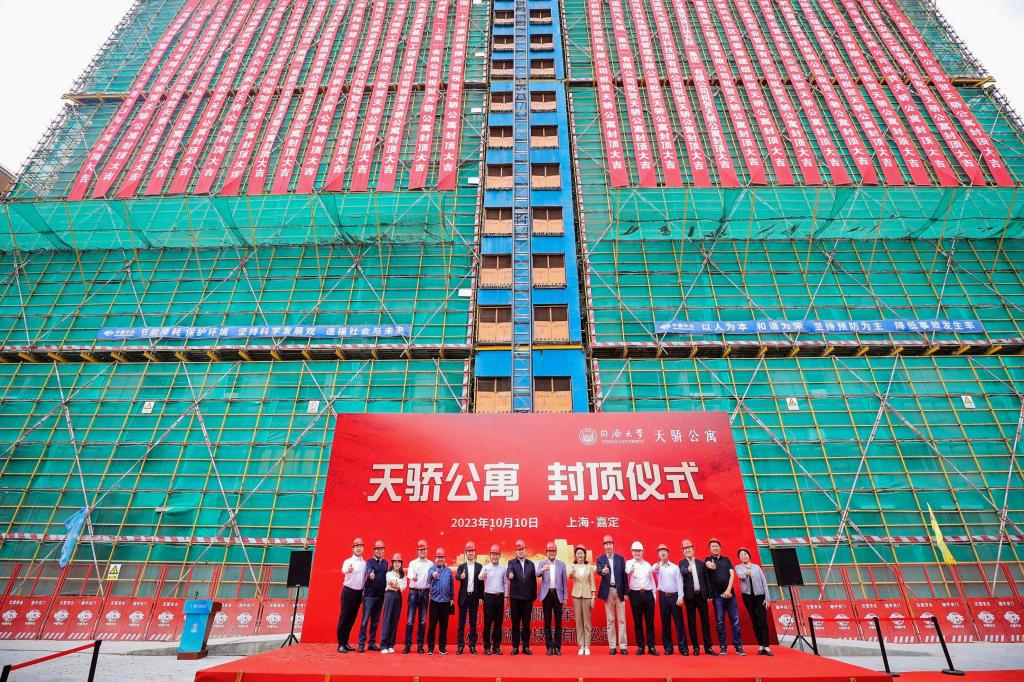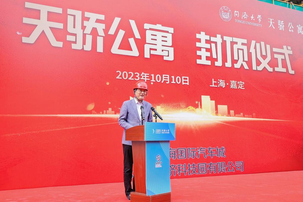 10月10日上午,天骄公寓主体结构全面封顶仪式举行。同济大学副校长雷星晖、上海国际汽车城集团总经理潘晓红、中国二十冶集团副总经理夏士龙,及同济大学国家大学科技园、嘉定管委办、基建处、后勤保障处、党委学研工部、同济创新创业控股有限公司、同济大学建筑设计研究院(集团)有限公司、监理单位相关负责人等出席仪式。