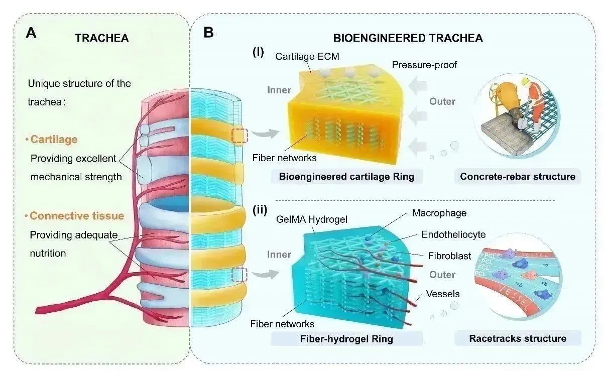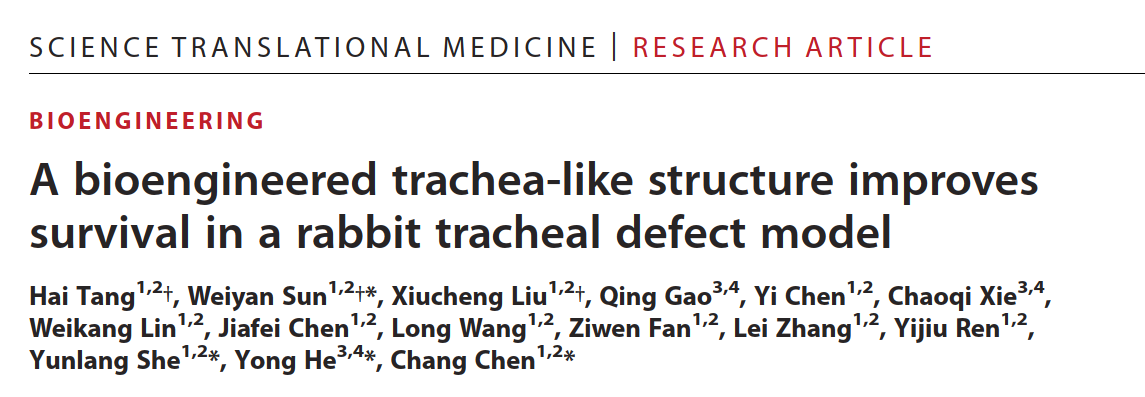 气管作为人体气体交换的唯一通道,出现阻塞可能随时夺去患者生命。气管肿瘤、外伤或先天性疾病均可能导致气管狭窄阻塞的出现。手术切除并进行端-端吻合是临床常用手段。但当病损范围过长,端-端吻合会造成过大的吻合口张力,导致气管瘘、气管破裂等严重并发症,而非活性的气管替代物也因为并发症严重,无法临床应用。因此,长段气管狭窄患者无法手术,只能保守治疗短暂延长生命,临床亟需可移植的活性气管,替换气管病损部位,帮助患者维持呼吸功能。然而气管组织结构复杂,长期暴露于外界空气中导致感染风险高、损伤愈合难度大,可移植的活性气管一直被全球医学界认为无法再造。近期,同济大学陈昶团队和浙江大学贺永团队合作,基于3D打印超细纤维网络支架构建一种生物工程气管,同时模拟天然气管的解剖结构和生物功能,并形成益于再生的免疫微环境,在实验动物气管缺损模型的修复中展示出较高的临床潜力。相关工作“A bioengineered trachea-like structure improves survival in a rabbit tracheal defect model”发表于专注于转化医学研究的Science子刊Science Translational Medicine。