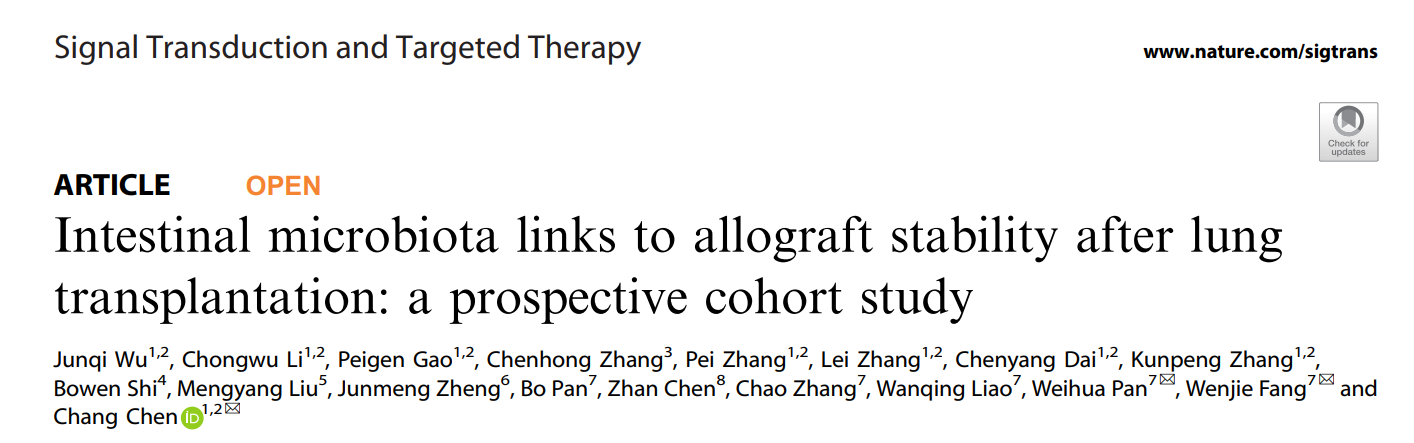 肺移植术是治疗终末期肺部疾病的重要治疗手段,然而手术后的并发症,尤其是同种异体移植排斥(AR)和肺部感染(PI),仍然是患者面临的重大挑战。这些并发症不仅会影响患者的生存率,还会降低手术的成功率。为了解决这一问题,需要深入了解肺移植患者术后的机体相关生物学过程。近期,由同济大学附属上海市肺科医院陈昶教授、海军军医大学方文捷教授和潘炜华教授等杰出科学家组成的研究团队,在Signal Transduction and Targeted Therapy上在线发表了题为“Intestinal microbiota links to allograft stability after lung transplantation: a prospective cohort study”的前瞻性研究论文。该研究是国际上首个揭示肠道微生物与肺移植同种异体移植物稳定性之间联系的多中心研究,同时也为未来的肺移植研究和治疗提供了新的靶点与方向。