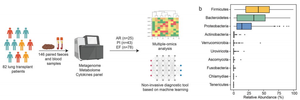 研究团队在4个不同的肺移植中心建立了一个前瞻性队列,涵盖了来自4个中心的85例肺移植受者(LTRs)。同时进一步收集了这些肺移植患者术后成对的粪便和血清标本,并根据采样时的诊断将样本分为AR、PI和无事件(EF)组。通过宏基因组测序法对粪便样本进行了深入分析,结果显示AR的肠道微生物组表现出明显的减少物种和多样性的特征。同时,针对血清标本及临床信息的进一步检测分析揭示了AR和PI的血清代谢物减少和炎症细胞因子增加。值得注意的是,单形拟杆菌(Bacteroides uniformis)在AR中的减少与血清中IL-1β和IL-12存在显著的负相关关系,这为肠道微生物群落影响肺移植术后移植物稳定性提供了新的机制解释。此外,该研究还进一步联合微生物组、代谢组和临床参数构建了能够高效预测AR(AUPRC=0.801)和PI(AUPRC=0.855)的机器学习模型,其中微生物组数据集显示出特别高的诊断鉴别能力。总之,破坏性肠道微生物群与同种异体移植排斥和感染以及肺移植后的全身细胞因子和代谢物显著相关。