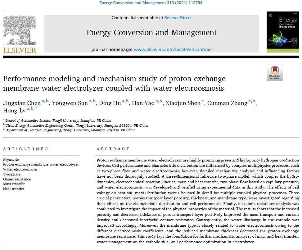 7月3日,汽车学院张存满教授团队题为“Performance modeling and mechanism study of proton exchange membrane water electrolyzer coupled with water electroosmosis”的研究性论文在线发表于Elsevier旗下高影响力综合期刊《能源转换和管理》(Energy Conversion and Management)。