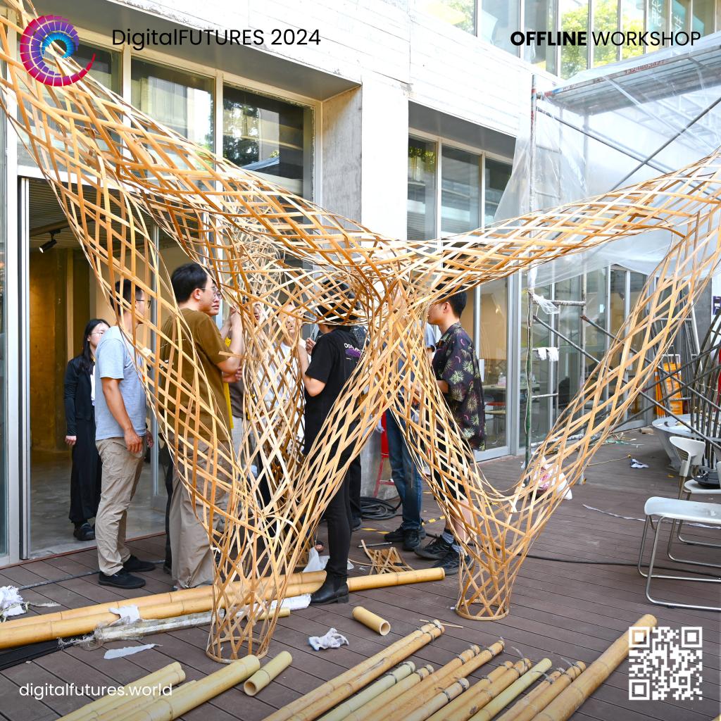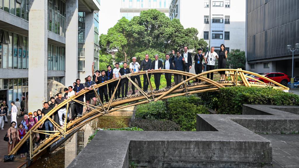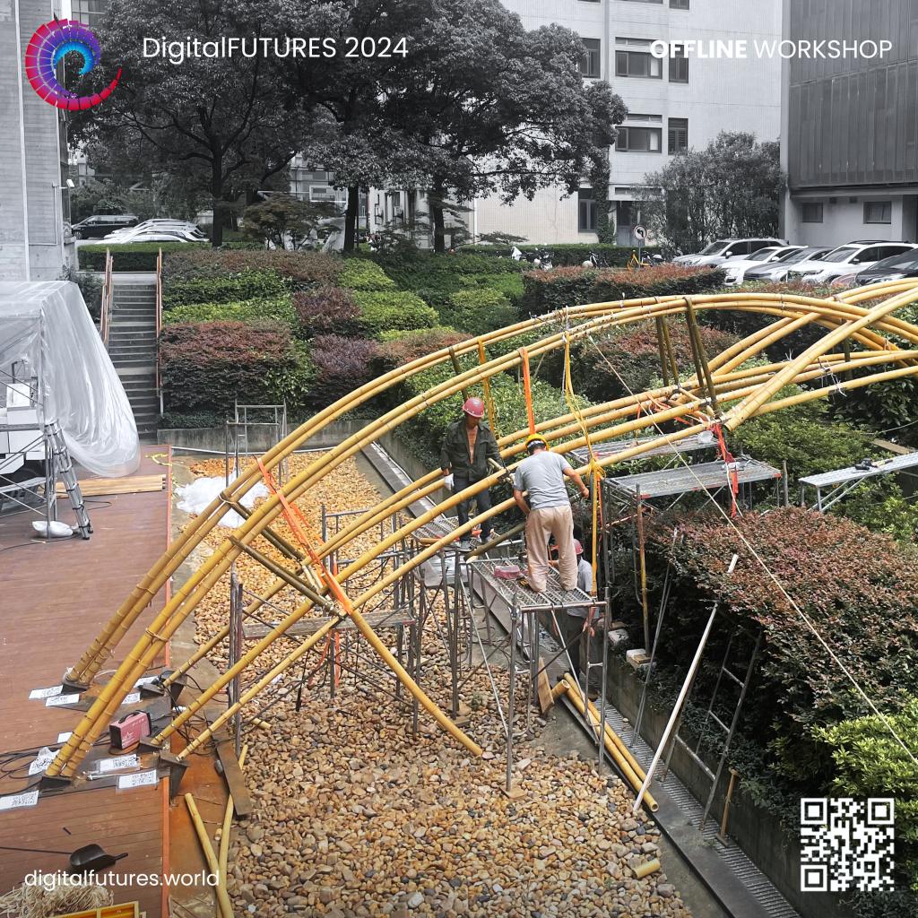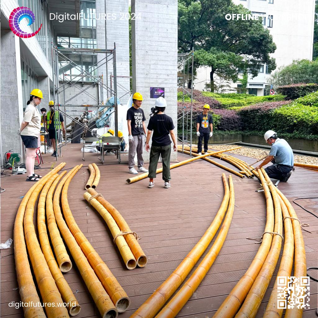 近日,建筑与城市规划学院前的一座竹结构桥梁吸引了众多目光,这正是2024年“数字未来”(DigitalFUTURES)工作营的标志性成果之一。此次工作营以“众脑、同驱与共存:探索一种新型建筑学”为主题,通过智能建造工作营、AI智能建造论坛以及成果展览等活动,为大家带来了一场关于数字设计与建造前沿成果的盛宴。
