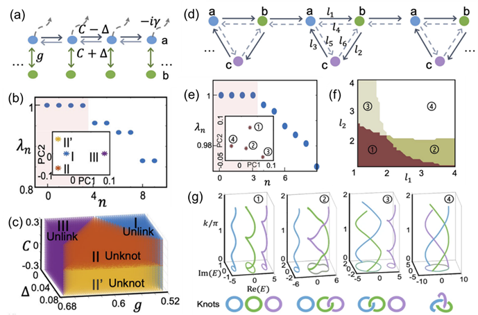 纽结理论在自然科学中具有特殊意义,为理解各种物理系统的拓扑性质和相互作用提供了一种至关重要的数学语言。例如,从杨-巴克斯特方程解中导出的纽结不变量用于表征量子态的纠缠和拓扑性质。此外,纽结理论有助于探索拓扑问题,如拓扑绝缘体和拓扑超导体,它们表现出奇特的物相和受保护的性质。最近人们发现在倒易准动量空间中,非厄米能带结构的不同拓扑相可以用辫子编织群进行分类。而辫子编织群与纽结密切相关。将辫子编织的两端相连而形成的闭合结构就能够代表纽结。