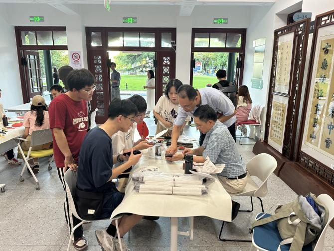 随后,师生们在讲解员的引领下,近距离欣赏了书法比赛的优秀作品,并开展了中秋主题的书法沙龙。师生们挥毫泼墨,体验书法创作,品尝传统美食。