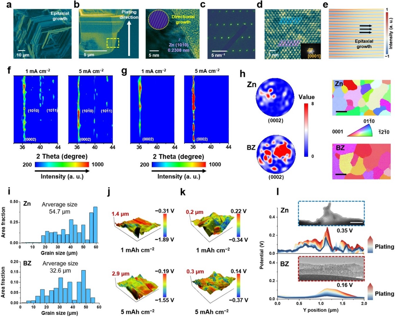 实验和理论分析表明,所制备的负极对锌离子的定向调控使得负极/电解液界面电荷分布更均匀,有利于负极的外延生长。