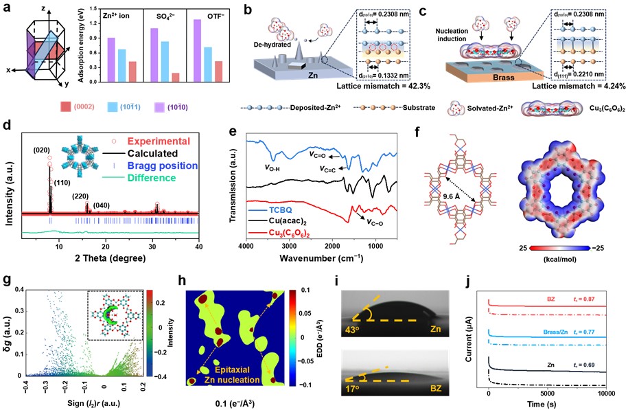 同济大学化学科学与工程学院刘明贤教授团队近期报道了一种单一(0002)晶面暴露的锌负极,从根源上消除了晶格错位。该负极由黄铜箔,金属有机框架Cu3(C6O6)2膜和电沉积的锌层构成。黄铜箔与电沉积锌层之间的低晶格失配度(4.24%)使得成核的锌能够沿着(0002)面生长,而多孔Cu3(C6O6)2膜加速了锌离子去溶剂化过程,实现了持续的(0002)织构定向生长和高效的负极可逆循环,相关成果以“Single Exposed Zn(0002)Plane and Sustainable Zn-Oriented Growth Achieving Highly Reversible Zinc Metal Batteries”为题发表于国际知名期刊《德国应用化学》(Angewandte Chemie International Edition)。