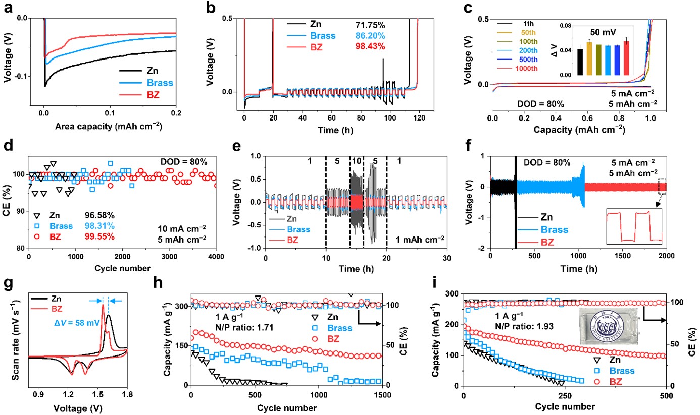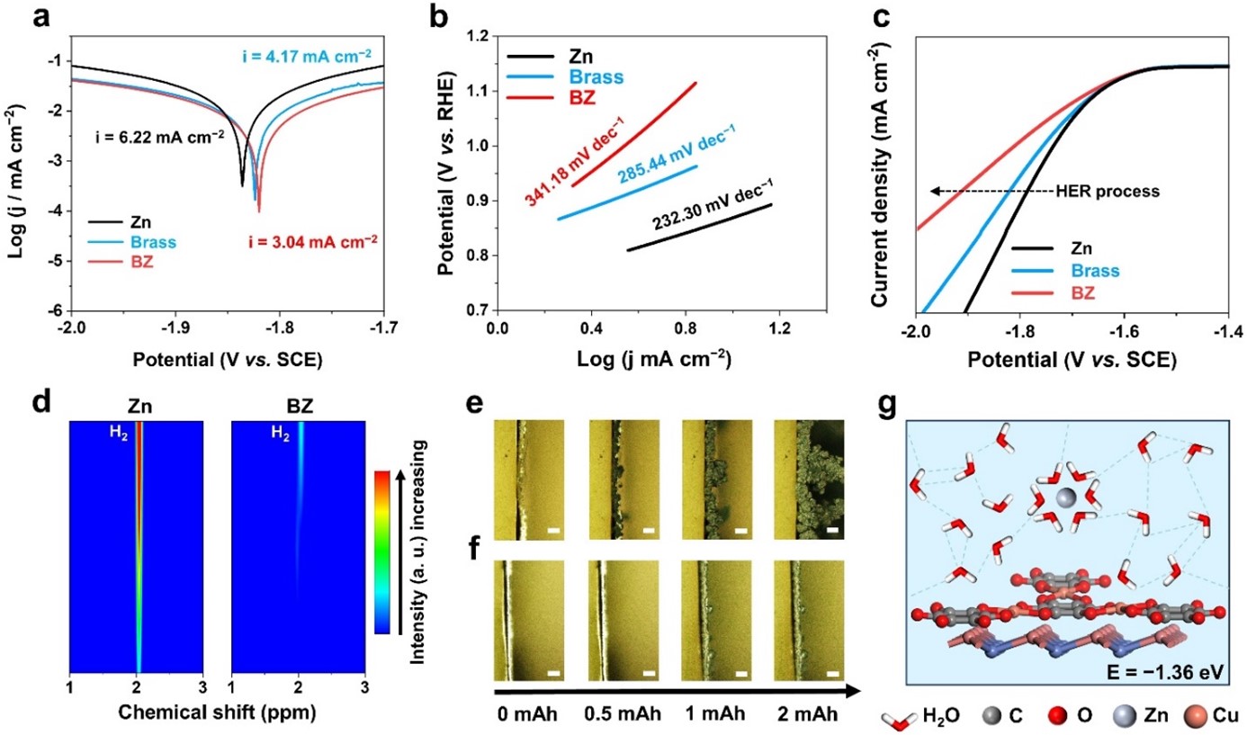 塔菲尔曲线和原位气相色谱等测试表明,单一(0002)平面暴露的锌负极延缓了负极表面的析氢反应和电化学腐蚀速率,从而抑制了枝晶生长。