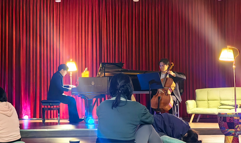 音乐会的第二乐章呈现出更为卓越的艺术魅力。在此次演出中,肖邦的大提琴与钢琴奏鸣曲第三乐章广板,由音乐表演专业的罗橼与马精烛两位同学共同演绎。他们以精湛的技艺展现了该乐章的深邃情感,其悠扬的旋律如同穿越时空的使者,深深打动了现场每一位观众的内心。