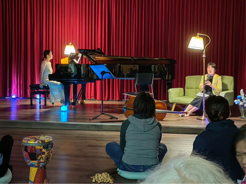 音乐会的开场部分以巴赫的经典名作《羊儿安静地吃草》作为序章,隋欣老师演奏的钢琴旋律柔和而细腻,宛如春日的和煦微风,引领现场观众缓缓闭上双眼,在音乐家的引领下,以身体语言传达内心的感受。继而肖邦的《雨滴》前奏曲进一步深化了情感的表达,使现场氛围达到了更为微妙的情感层面,观众们在音乐的渲染下,仿佛感受到了雨滴轻拂心湖的波纹,心灵得到了温柔的抚慰。随后,德彪西的《月光曲》犹如夜空中最耀眼的星辰,在周彬老师的疗愈指导下,使得每一位参与者得以实现心灵的释放与宁静。