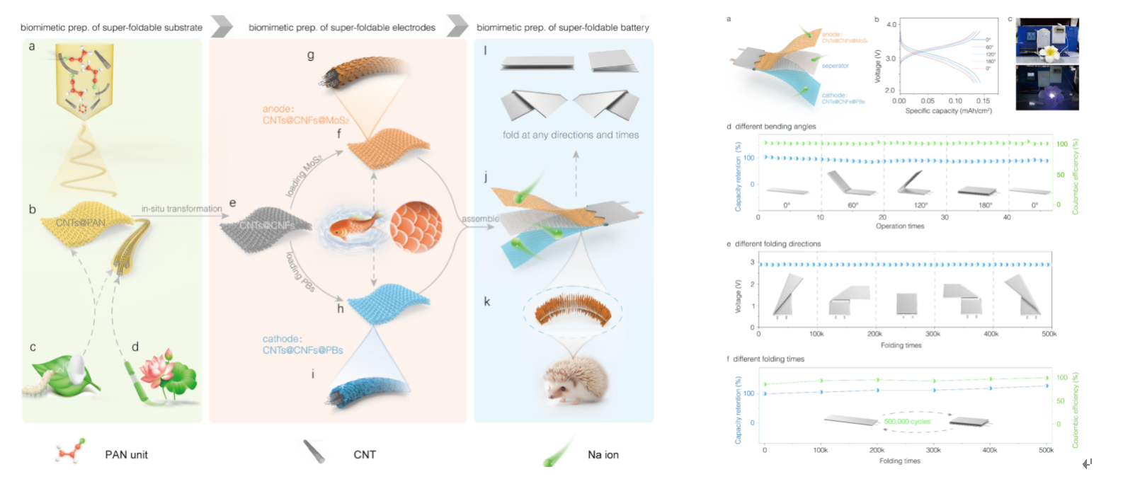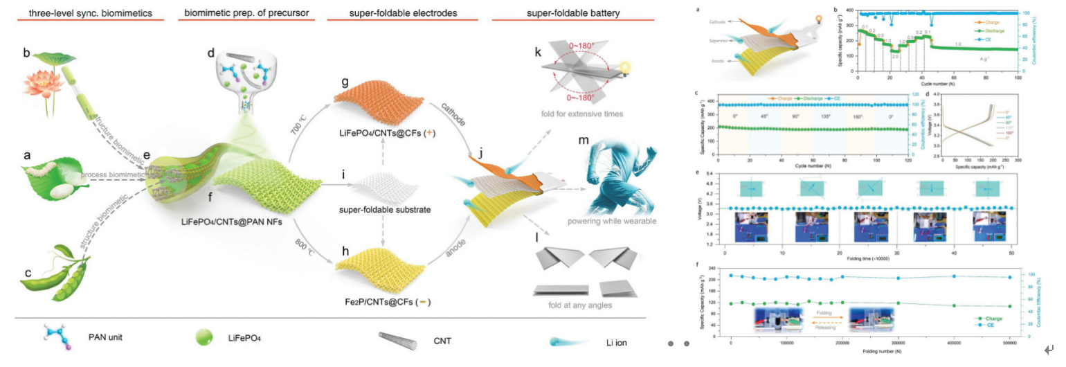 随着柔性电子的快速发展,人们对柔性产品的性能提出了越来越高的要求,不仅需要弯曲、扭曲和大幅度拉伸,而且需要大量无损任意真折叠(即超折叠)。面对这种极致要求,不仅市面上的折叠屏手机(铰链结构)做不到,目前世界上的所有柔性电子产品都无法做到。为此,同济大学化学科学与工程学院吴彤研究员带领团队成员经过艰苦探索,在用一级仿生技术首次制备出超折叠基底材料的基础上,研究出二级、三级乃至多级仿生技术,制备出世界第一例能够经受50万次超折叠而无明显结构与性能变化的锂离子电池和钠离子电池,继而又在超折叠锂硫电池、水系电池和超折叠电容电池等一系列超折叠储能器件方面实现了突破。