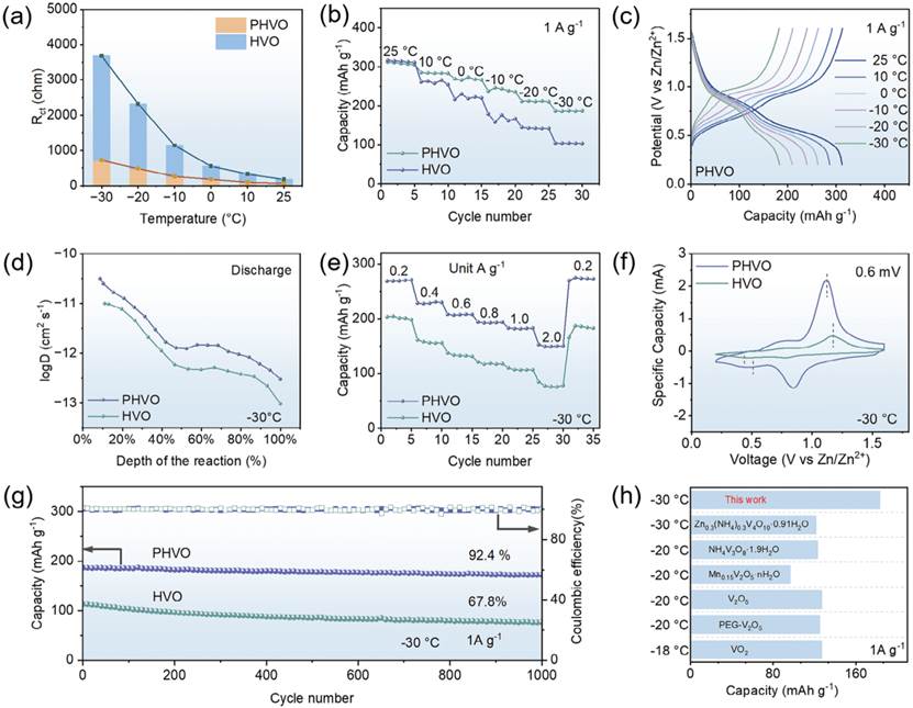 图4、a)不同温度下HVO和PHVO的Rct。c)不同温度下Zn//PHVO电池的GCD曲线。f)Zn//HVO和Zn//PHVO电池的CV图。h)Zn//PHVO电池与最近报道的钒基材料在低温下的电化学特性比较。
