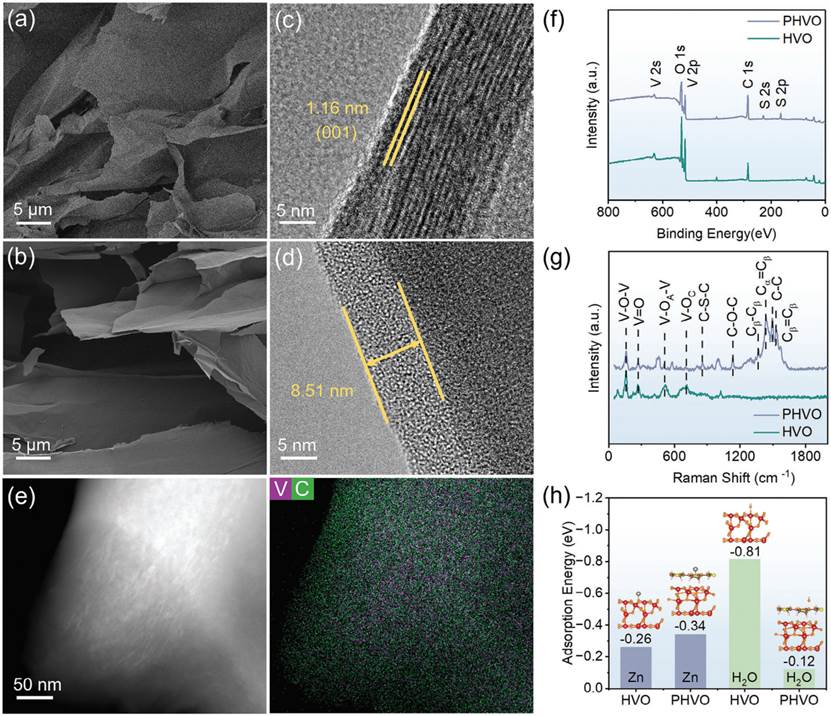 图1、a)HVO和b)PHVO的扫描电镜图像。c)HVO和d)PHVO的HR-TEM图像。e)PHVO的STEM和STEM-EDS元素图谱。f)HVO和PHVO的全谱XPS光谱和。g)拉曼光谱。h)PHVO模型上的吸附位点和计算吸附能。