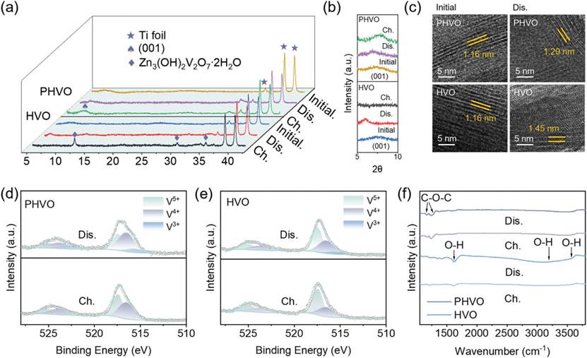 图2、a)HVO和PHVO的原位X射线衍射图。b)原位X射线衍射图的局部放大图。c)HVO和PHVO初始状态和放电状态的HR-TEM图像。d)PHVO和。e)HVO在充电和放电过程中的原位高分辨率V2pXPS光谱。f)HVO和PHVO在充电和放电状态下的原位傅立叶变换红外光谱。