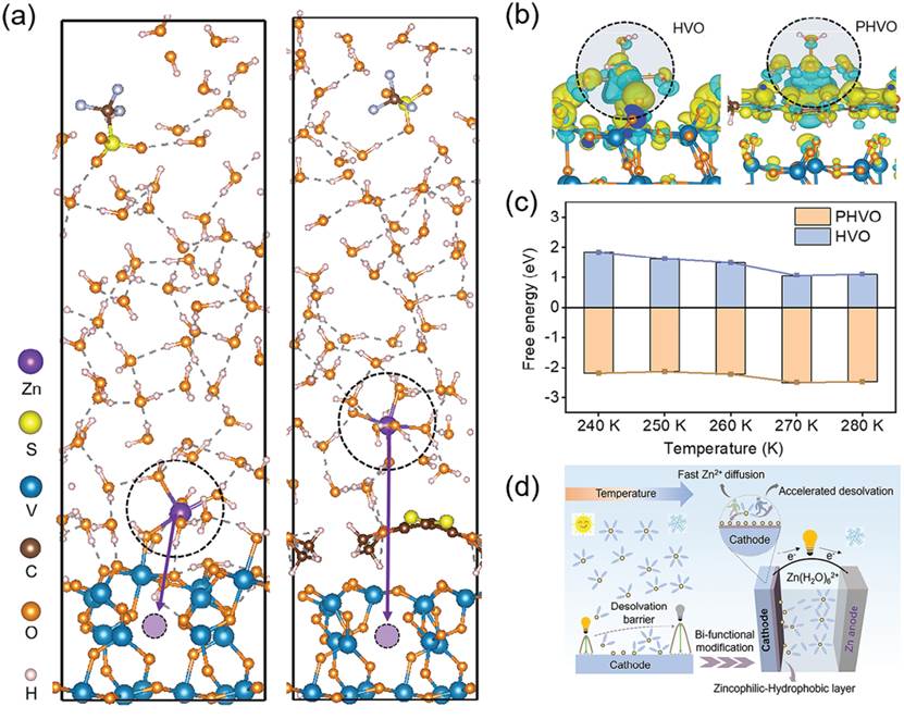 图3、a)HVO和PHVO的AIMD模型示意图。b)水合Zn2+与吸附基质之间的电荷差。c)240-280K温度范围内HVO和PHVO的自由能。