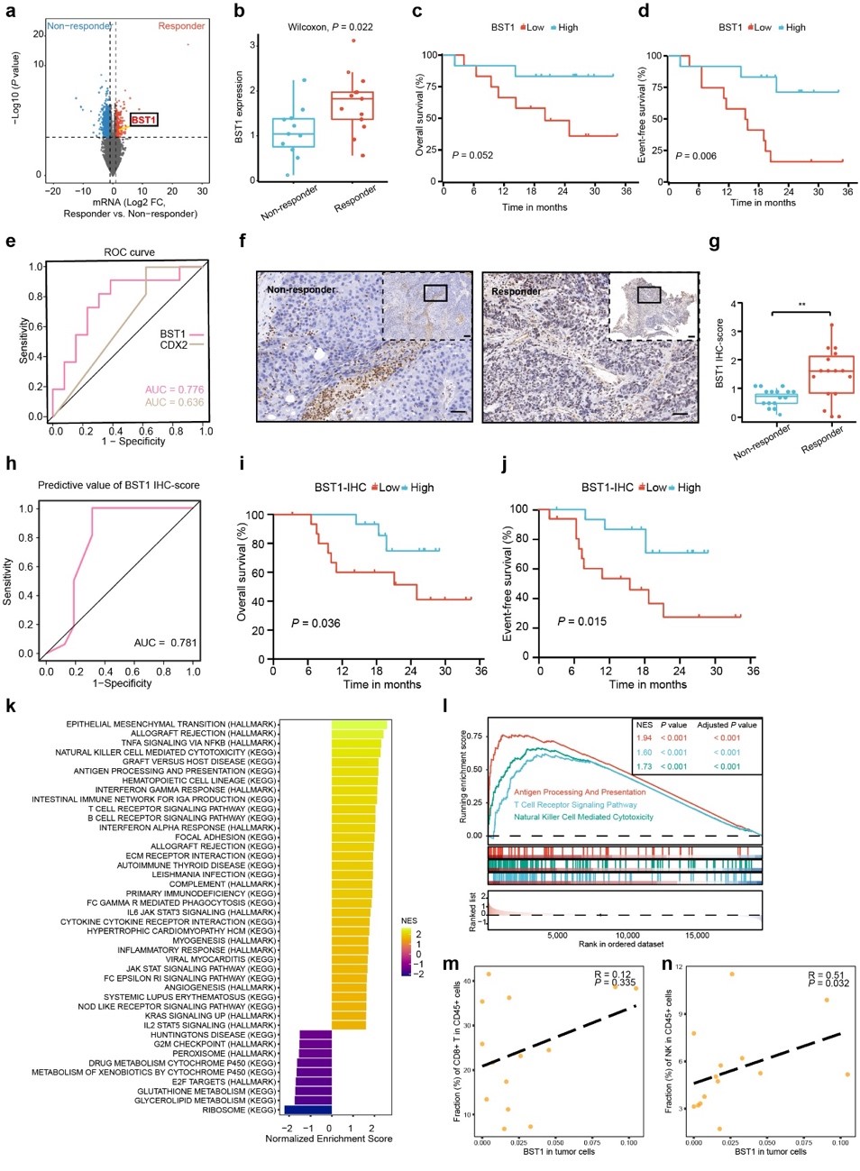 该研究同期收集了接受免疫联合化疗诱导治疗前后的肿瘤组织以及转移淋巴结样本,对其进行Bulk-RNA测序。通过对比治疗响应者和无响应者的基因表达,进行差异分析发现对免疫联合化疗诱导治疗响应的患者在基线期高表达BST1(骨髓基质细胞抗原1),且BST1高表达的患者无事件生存期更长(图2)。此外,研究还发现响应者和无响应者肿瘤免疫微环境在治疗前后的变化程度差异显著。响应者治疗后表现出免疫激活的特征:T细胞和NK细胞相关通路以及抗原提呈通路的表达显著升高。