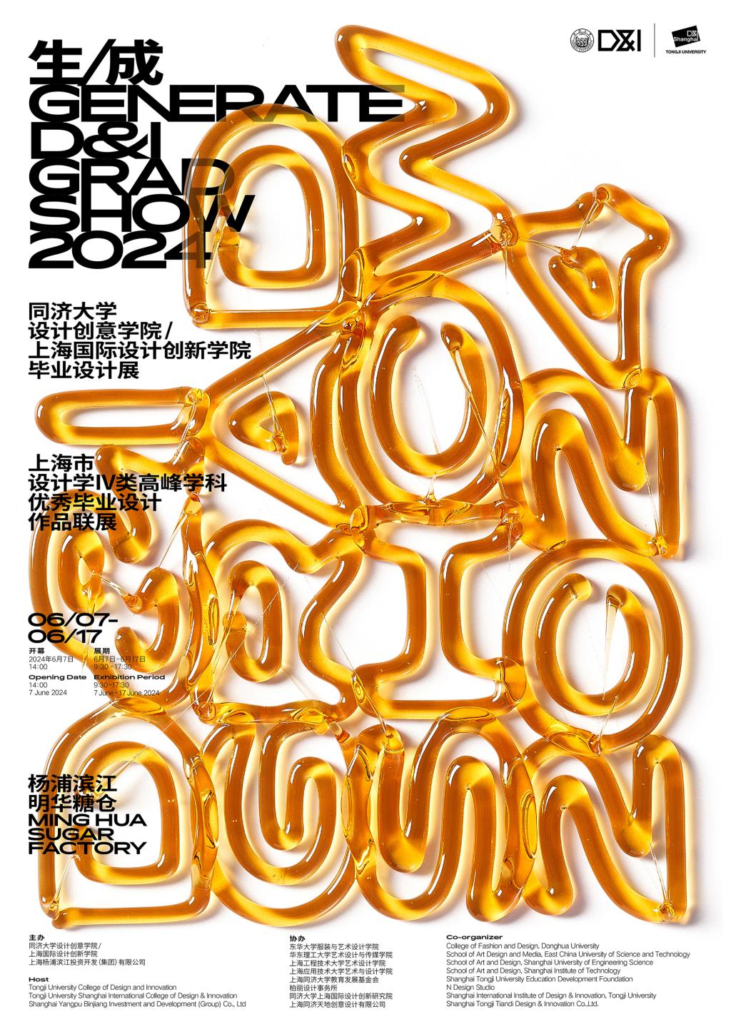 在获奖作品中,有1件为2024年同济大学设计创意学院/上海国际设计创新学院毕业设计展的主视觉海报,由孙大旺、郑康奕、潘惠共同创作。作品将人工智能技术与中国传统手工艺相结合,创造出一种新的“糖画字体”,是一次探索科技与艺术相结合的实验性尝试。其创作过程也与展览主题“生成”巧妙呼应,隐喻了学生们的设计作品如同糖画的生成一般,调制、溶解、塑造、成型。