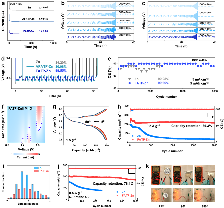 电化学性能表明,晶粒细化后的锌负极提高了锌离子在电极/电解液界面的沉积/剥离效率,Zn||Cu电池在10 mA cm−2下循环6000次平均库仑效率达99.6%,Zn||Zn电池实现5000 h稳定电沉积/剥离。Zn||MnO2软包电池充放电1000次容量保持率是商业锌板的7倍。