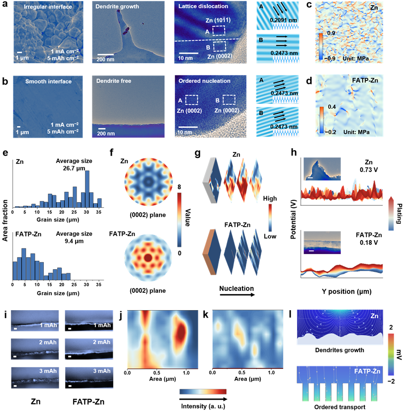 在商业金属锌箔表面光聚合高度结晶氟化蒽三苯聚合物,形成有序纳米通道(1.5 nm),有效降低成核能(0.2 e−/Å3)和晶粒应力(−0.2 ~ 0.4 MPa),细化电镀锌晶粒和缓解应力积累(9.4 μm/3.7 MPa,商业锌:26.7 μm/28.2 MPa),促进Zn (0002)面定向成核和外延生长。