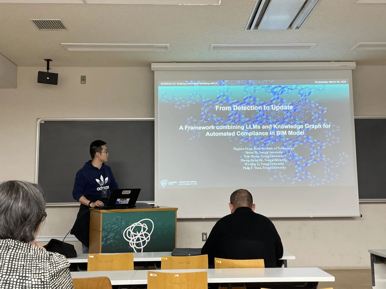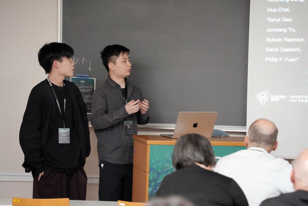 在2025CAADRIA中,同济学子在生成和算法设计论坛、人工智能结合建筑信息模型论坛、城市环境建模和模拟论坛、机器人装配与建造论坛、数字驱动的太阳能环境性能优化论坛、数字化文化遗产与三维扫描技术论坛、增强现实辅助建造论坛、物理形态找形与仿真论坛、可编程智能材料系统论坛、数字化竹结构论坛等多个主题论坛中进行了精彩纷呈的学术汇报。