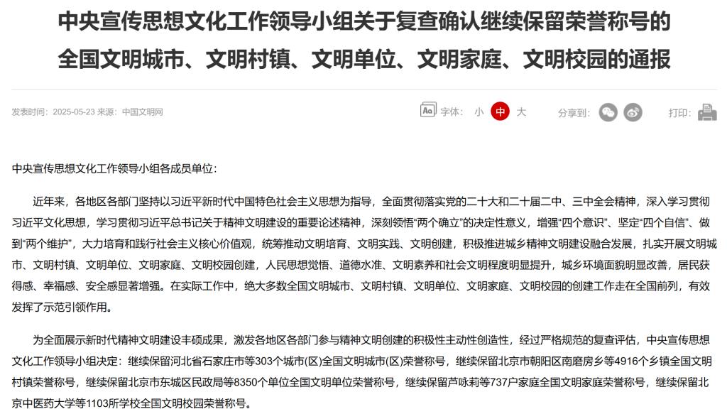 5月23日,中央宣传思想文化工作领导小组关于复查确认继续保留荣誉称号的全国文明城市、文明村镇、文明单位、文明家庭、文明校园的通报发布,同济大学继续保留“全国文明校园”荣誉称号。