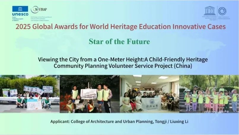 在近日于法国巴黎举行的第47届世界遗产大会“面向未来的世界遗产教育——全球创新合作网络与能力建设”主题边会上,2025“全球世界遗产教育创新案例奖”获奖名单揭晓。同济大学建筑与城市规划学院师生牵头开展的“一米高度看城市:儿童友好型遗产地社区规划志愿服务项目”脱颖而出,荣获“未来之星”(共有10项案例获得这一奖项)。