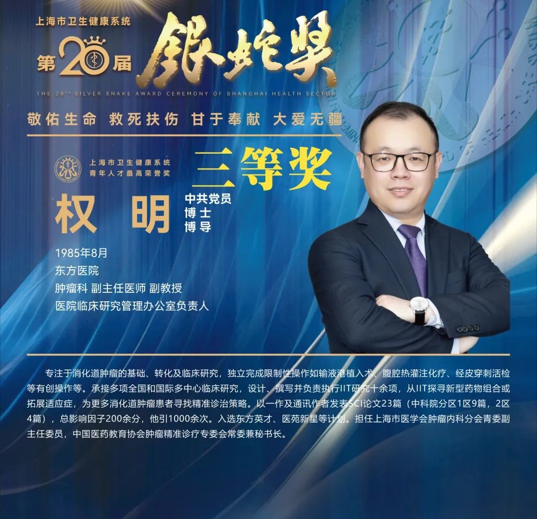 自1989年设立以来,银蛇奖每两年评选一次,旨在表彰奖励40周岁以下的杰出青年医务工作者,如今已成为上海医学人才的重要孵化器。36载光阴荏苒,银蛇奖见证了无数医学人才的成长与蜕变。当年荣获银蛇奖的青年才俊,如今已在各自领域成为中流砥柱,其中不乏学科泰斗。第二十届银蛇奖是一场医学人才的薪火相传,据不完全统计,677位获奖者中,走出了9位院士,荣获了近百项国家科技进步奖,诞生了一批优秀人才,许多获奖者担任了国家级、省部级重要学术团体中主任委员、副主任委员,获得600多项国家发明专利,近200项成果转化超2亿。