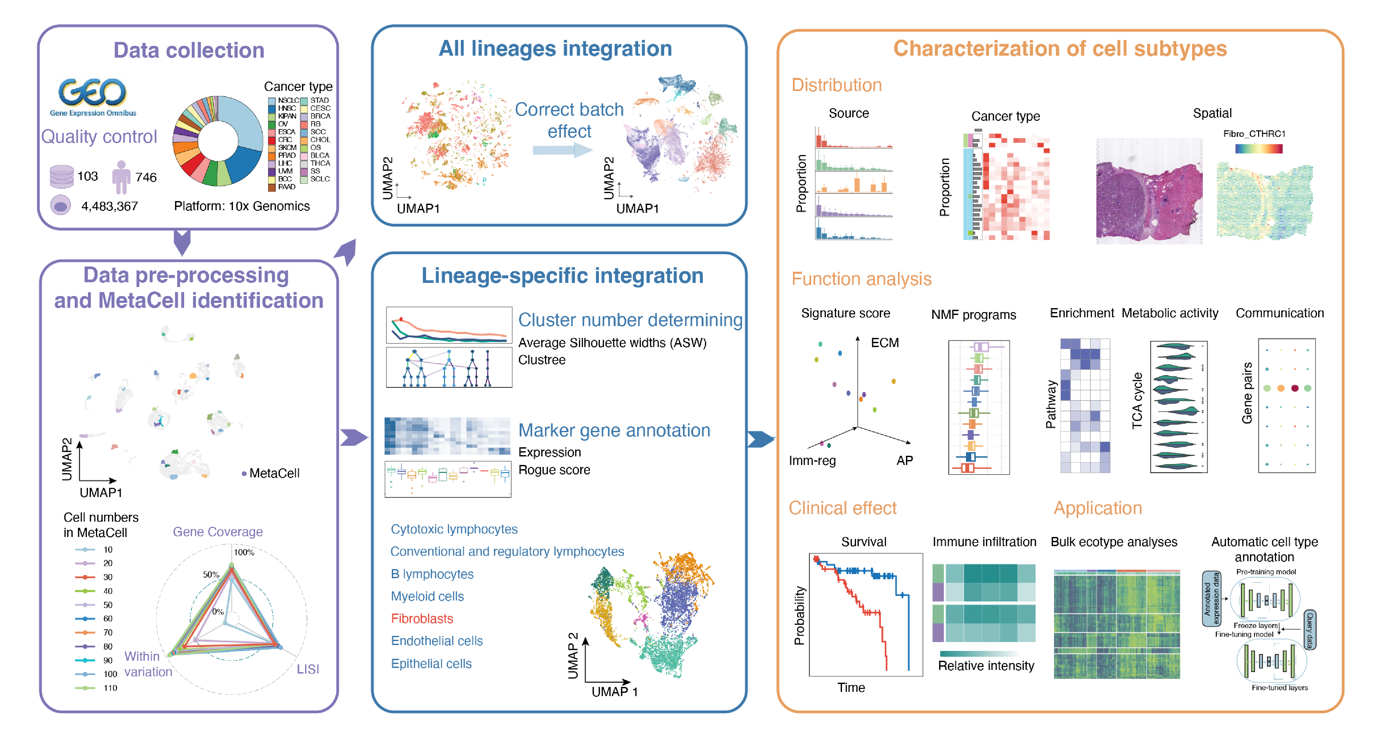 肿瘤是全球范围内导致人类死亡的主要原因之一。由于肿瘤微环境的不断进化及患者之间肿瘤微环境的高度异质性,只有少部分患者能够从免疫治疗和靶向治疗中受益。了解肿瘤进展过程中微环境的细胞组成变化,以及解析潜在促进其空间生态位产生的多细胞互作,对于准确靶向肿瘤微环境至关重要。目前,已有许多研究鉴定出在特定癌症中起抗肿瘤或促肿瘤作用的基质及免疫细胞类型。然而,由于癌症发生所在器官中组织驻留细胞的不同,不同癌症类型的肿瘤微环境中细胞状态和相互作用可能存在显著差异,阻碍了泛癌尺度有效的靶点开发。同时,领域内目前多数的泛癌分析往往关注于单一细胞类型,忽略了多细胞协作形成的空间结构对肿瘤发展及治疗效果的影响。