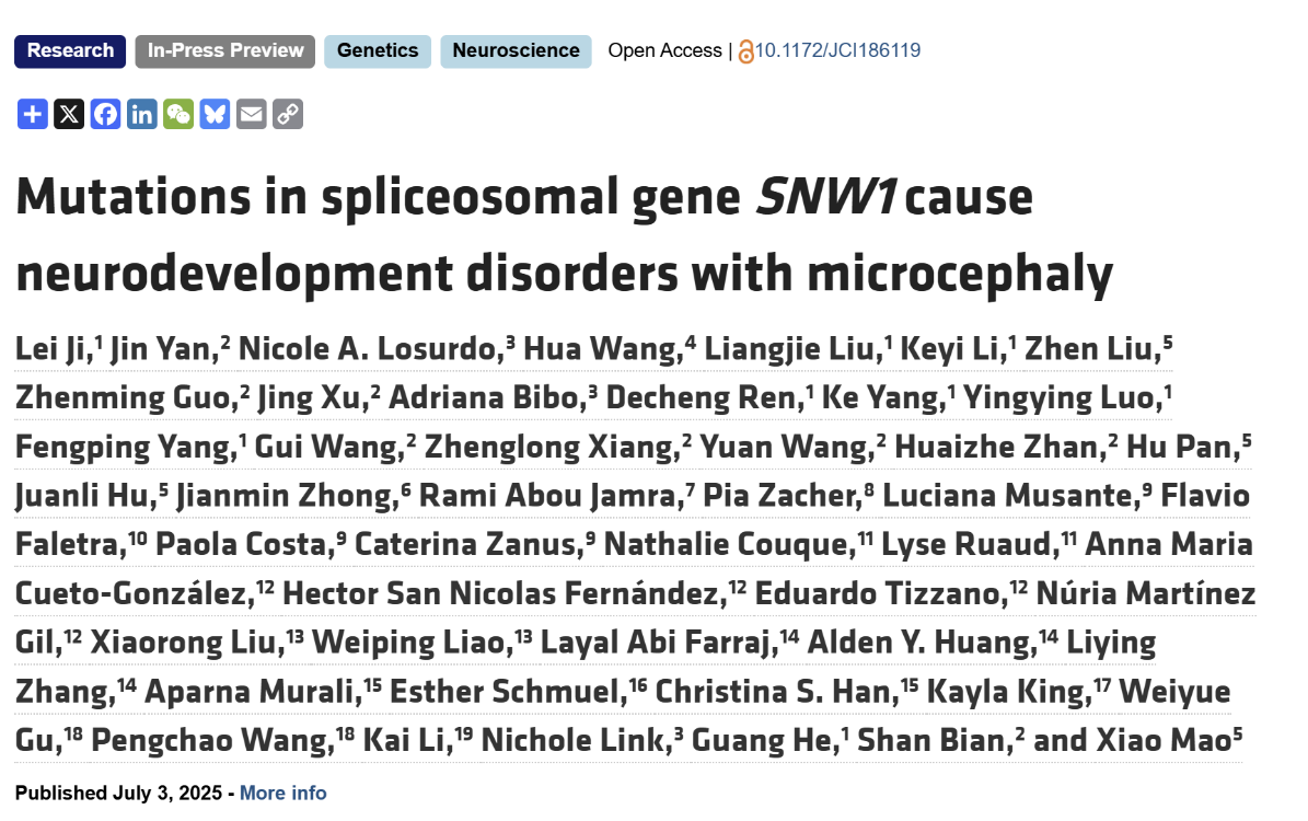 近日,湖南省妇幼保健院毛翛研究员、同济大学生命科学与技术学院边杉教授与上海交通大学Bio-X研究院贺光研究员共同在《临床研究杂志》(Journal of Clinical Investigation)在线发表题为“Mutations in Spliceosomal Gene SNW1 Cause Neurodevelopment Disorders with Microcephaly”的研究论文。该研究发现剪接体蛋白SNW1的杂合突变是导致伴原发性小头畸形神经发育障碍的新型遗传基因,并结合多研究模型系统揭示了其潜在的致病机制。