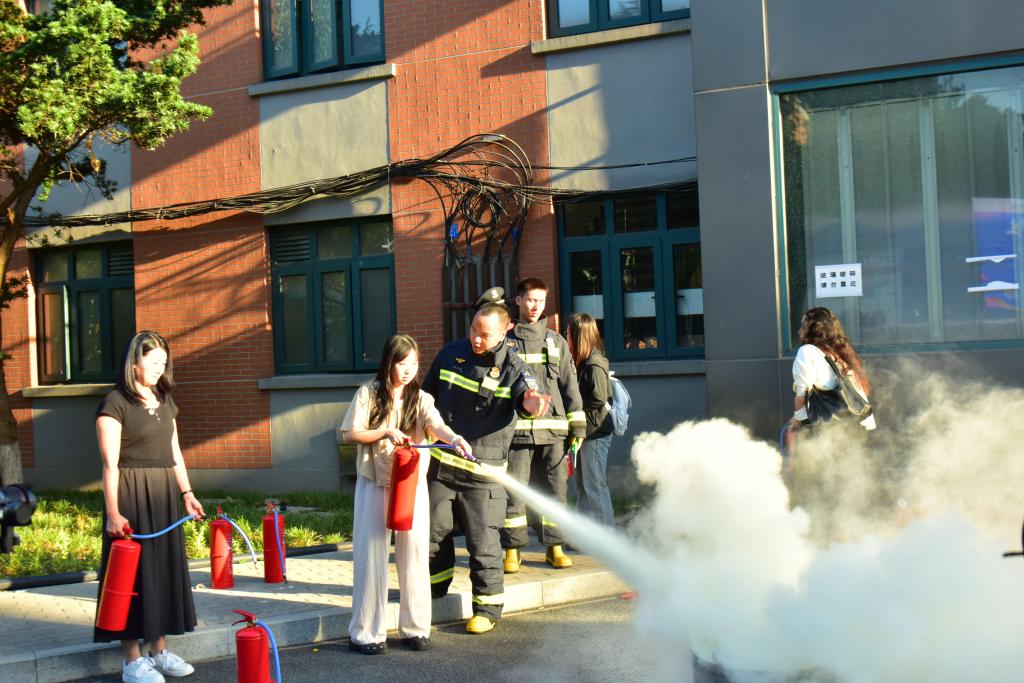 最后,由上海市普陀区消防救援局黄辰博教官进行现场实操演练。在消防员的指导下,学生们依次观看并体验了高空缓降逃生、烟气逃生模拟、消防救援灭火(灭火器、消防栓)等项目,切实提高了师生的防灾及突发事件应急处理能力。