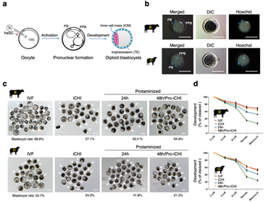 建立“类精子”表观修饰策略:当牛羊haSCs直接注射到卵母细胞(iCHI)替代精子后,雌性原核中组蛋白H3K4/K9/K27me3修饰异位表达,成为重构胚胎发育的“致命障碍”。团队先尝试过表达去甲基化酶KDM5B/4D/6A,但未能纠正修饰异常反而加剧了haSCs二倍化;最终通过瞬时表达鱼精蛋白(Prm1)策略,诱导haSCs细胞核浓缩为“类精子”结构,在细胞阶段替换“挤出”冗余甲基化修饰,成功获得了高质量Pro-iCHI重构胚胎,并获得健康可育活体牛(出生率14.3%),这一方案首次解决了单倍体重构胚胎发育难题,使囊胚形成率提升至体外受精胚胎水平,为后续基因编辑活体制备扫清了障碍。