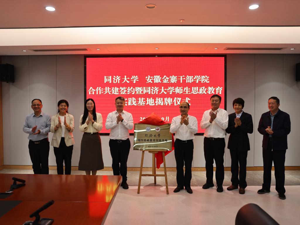当天下午,刘润一行赴六安市金寨县开展调研交流,并与金寨县委书记张涧举行座谈。张涧详细回顾了近年来同济大学和金寨县在干部培养、医疗卫生、社会实践等方面的交流合作历程,对同济大学一直以来对金寨的帮扶支持表示衷心感谢。他表示,此次合作共建是深化校地合作向更深层次、更广领域发展的具体行动,将以此次合作共建为契机,充分利用同济大学的学科优势,进一步在新能源、科技创新、科教融合等领域交流合作上取得新的成果,不断推动同济大学对金寨的帮扶优势转化为革命老区绿色振兴的发展优势。刘润介绍了同济大学的办学理念、学科特色和教学科研成果,并表示金寨县是著名的革命老区,红色底蕴深厚、历史资源丰富,要充分运用好金寨的红色资源,深化思政教育教学改革,强化师生理想信念。同时,按照“金寨所需、同济所能”,在“建设红色教育实践高地”“打造理论与实践创新基地”和“构建校地协同服务机制”方面同金寨携手共进,为金寨经济社会高质量发展贡献“同济智慧”。仪式上,同济大学党委学生工作部和安徽金寨干部学院签署合作共建协议。刘润、张涧为“同济大学师生思政教育实践基地”揭牌。