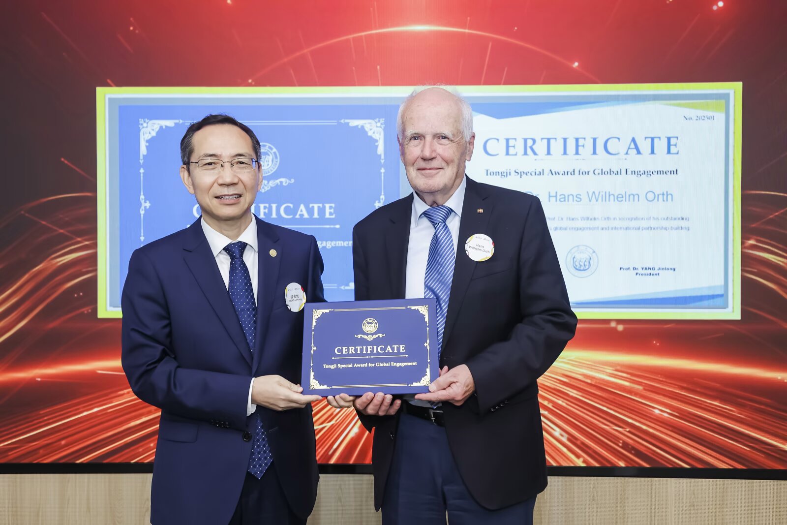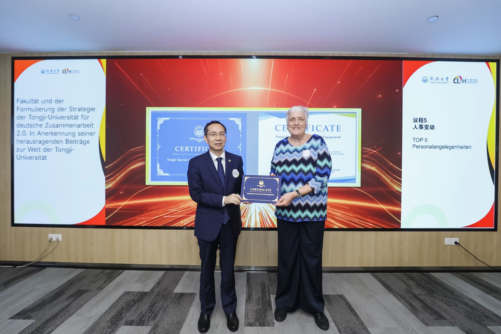 会议审议了理事会人事变动。杨金龙担任新任中德学部理事委员会主席,李翔宁担任中德学部主任。会上,杨金龙代表同济大学授予奥特和奥苏姗“同济大学全球参与特别奖”,表彰其对中德合作的杰出贡献。