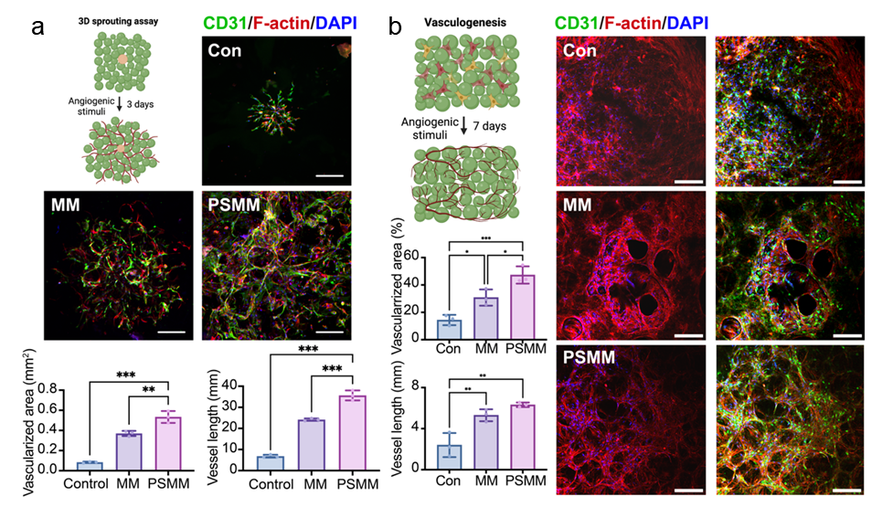 为了提高微凝胶的可注射性和与受损部位的整合能力,研究人员在微凝胶支架内引入了Matrigel/Collagen I (M/C)作为基质。M/C的引入不仅提升了可注射性,保证了细胞在注射过程中的活性,还显著增强了支架的促血管生成作用。HUVEC/MSC体外共培养实验表明,PSMM支架的血管长度为MM组的1.48倍,显示出更优越的血管化效果(图2)。同时HUEVC和HEF的混合培养也证明了两种微凝胶组的血管化面积都显著增加,但PSMM支架显示出更优的血管化效果。结合微凝胶支架孔隙统计结果(PSMM组微小孔隙占比明显高于MM组),推测可能是由于PSMM组内部微孔隙的存在为血管的形成和迁移提供了更多的空间。