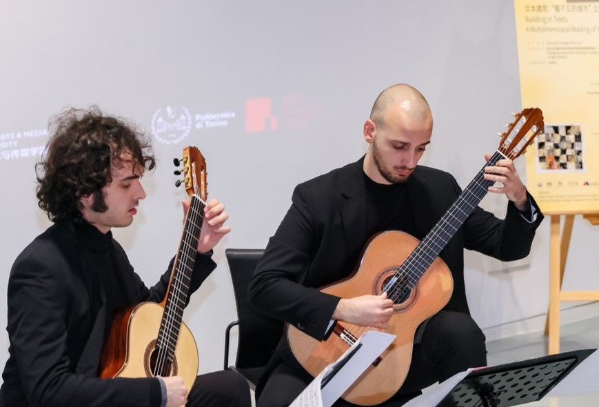 活动在悠扬的吉他音乐中拉开了序幕。意大利知名音乐家尼科洛·基亚拉蒙蒂(Nicolò Chiaramonti)、米开朗基罗·萨尔维尼(Michelangelo Salvini)登台,分享了全新音乐专辑《看不见的城市:乔治·米尔托的双吉他音乐》创作灵感。该曲目由两位音乐家组成的“萨尔维尼-基亚拉蒙蒂二重奏”(Duo Salvini-Chiaramonti)组合倾情演绎,旋律起伏之间,听众犹如亲临其境“漫步”不同城市空间,引人深思。