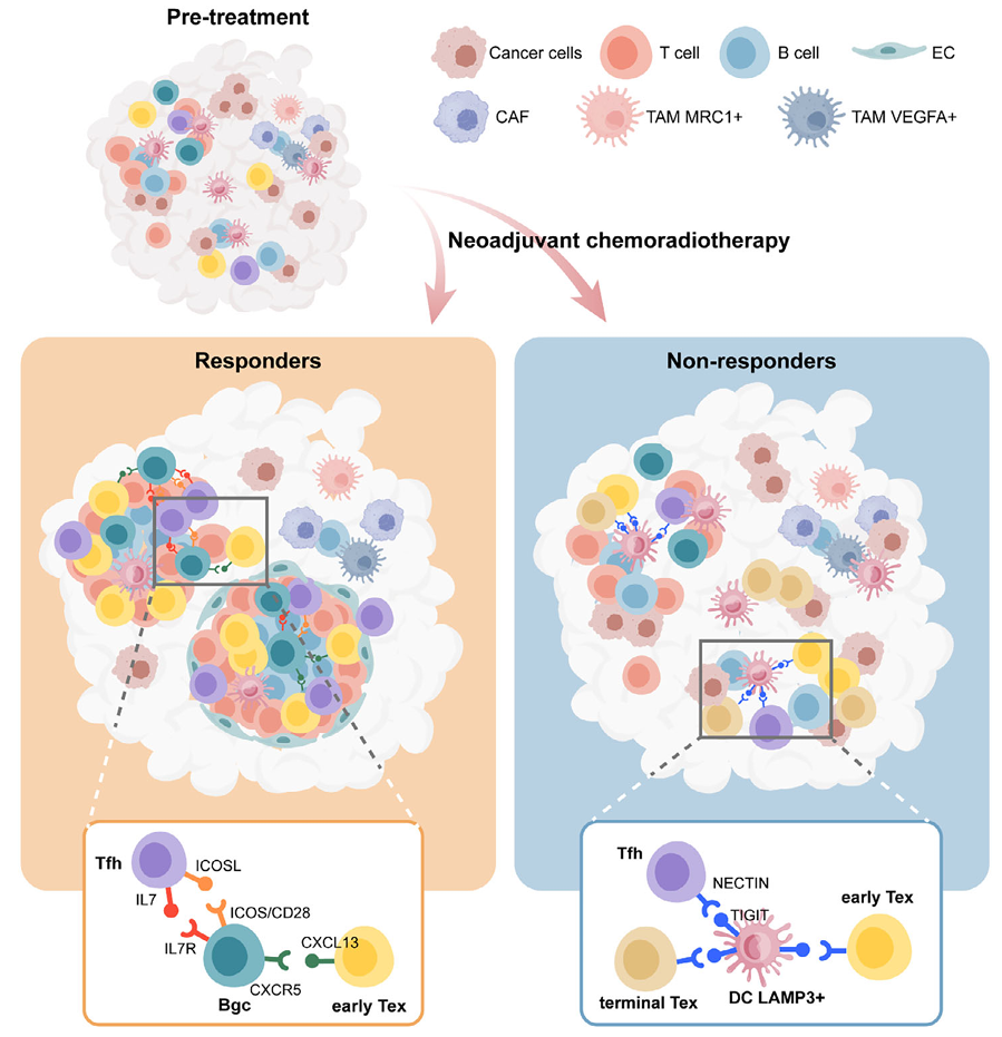 该研究通过对15例接受新辅助放化疗的患者进行单细胞RNA测序、全外显子测序和转录组测序,发现响应者与非响应者之间的基因突变谱无显著差异,而肿瘤微环境的免疫特征与治疗响应密切相关;鉴定出一类具有增殖能力和效应功能的早期耗竭T细胞亚群(early-Tex),与疗效高度关联,其高表达转录因子NR1D2,并在响应者中显著富集,该细胞亚群与经典前体耗竭T细胞(Tpex)在分子表型和功能上均有差异;响应者肿瘤组织中TLS数量更多、更成熟、更活跃,TLS的形成与Tfh细胞、B细胞和高内皮静脉(HEV)密切相关,并在空间转录组数据中得到验证;LAMP3+DCs通过表达IRF8等转录因子,增强其免疫抑制功能,并通过PD-1/PD-L1、TIGIT等共抑制分子通路促进T细胞耗竭,从而抑制TLS的形成,影响治疗效果。