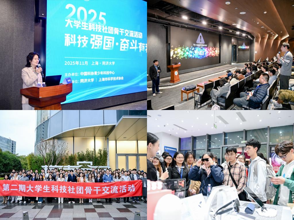 11月6日至10日,大学生科技社团骨干交流活动(第二期)在同济大学举行。本次活动由中国科协青少年科技中心主办,同济大学、上海市科学技术协会共同承办,旨在促进高校科技社团之间的交流与合作,培养大学生科技创新能力,共同探寻当代青年助力高水平科技自立自强的前行之路。活动以“科技强国·奋斗有我”为主题,来自全国55所高校的大学生科技社团骨干围绕人工智能、科学家精神、科技社团建设等主题,通过专题报告、实地研学、红色教育和社团交流等多种形式组织开展深入学习和研讨。