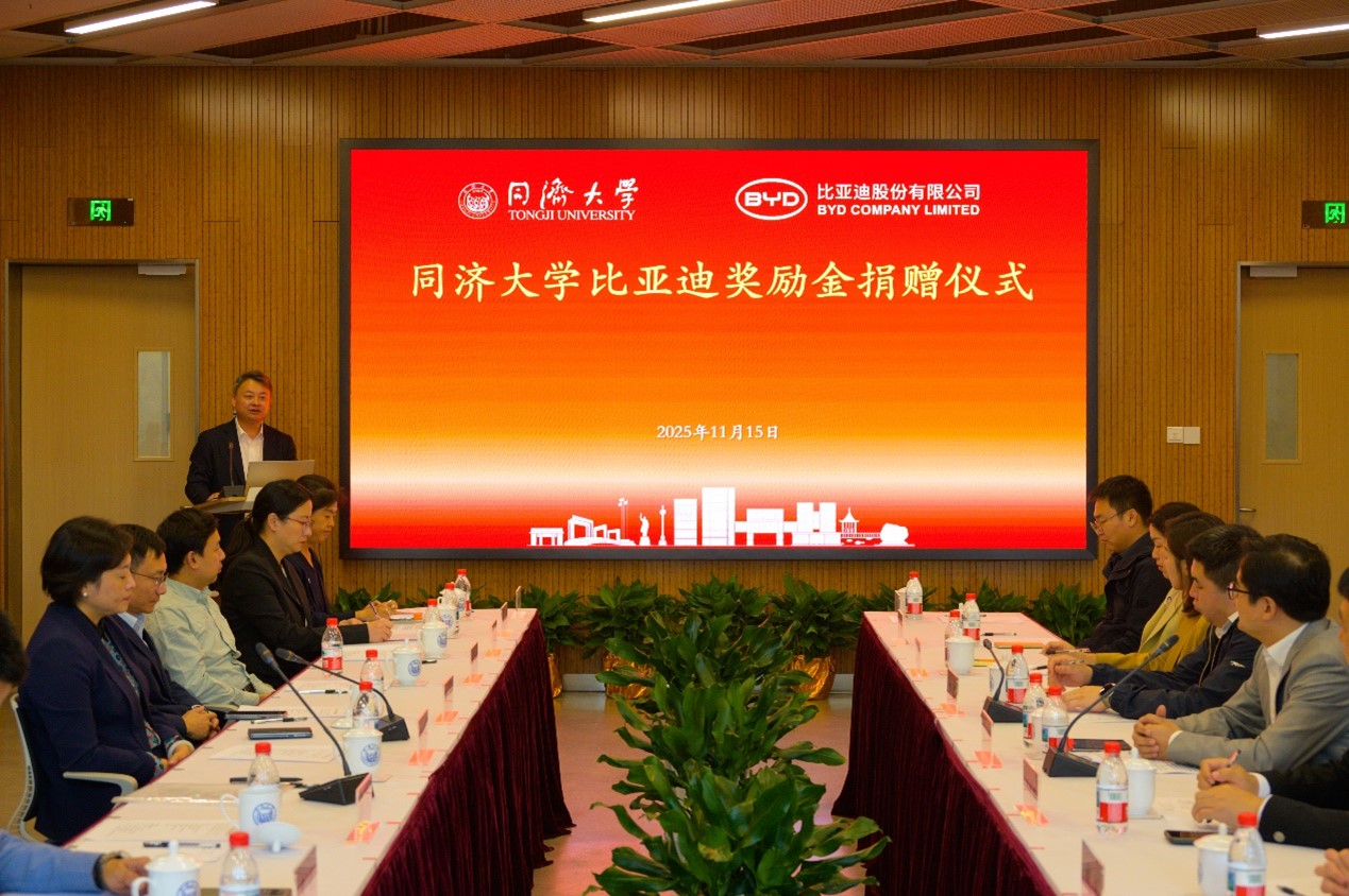 11月15日,同济大学比亚迪奖励金捐赠仪式在嘉定校区举行。比亚迪股份有限公司(以下简称“比亚迪”)品牌及公关处总经理、同济大学校友李云飞,同济大学党委副书记、教育发展基金会秘书长刘润,党委副书记曹静出席仪式。