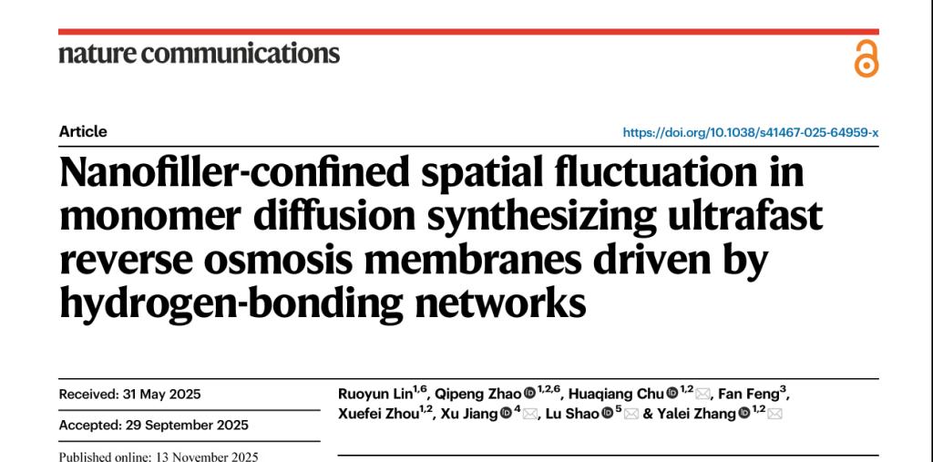 环境科学与工程学院张亚雷、褚华强团队在《自然·通讯》上发表调控单体扩散的空间波动构筑高通量反渗透膜