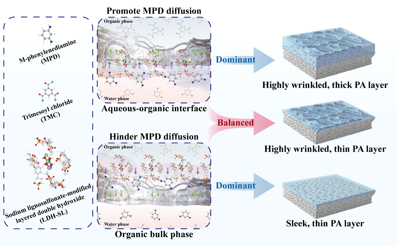 薄膜复合膜是解决全球水资源短缺、实现水资源可持续利用的关键技术之一,但其水渗透性与选择性之间长期存在着“trade-off”效应,这严重制约了RO技术的能效与规模化应用。本研究提出了一种全新的调控机制,通过在IP过程中引入木质素磺酸钠改性层状双氢氧化物(LDH-SL)复合纳米填料,实现了对单体扩散的“空间波动”调控。