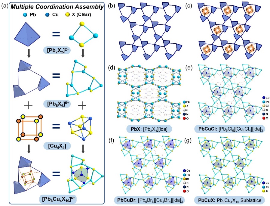 在前期研究中,该研究团队已发展出一种基于配位驱动组装的普适性方法,用于构筑水稳定的卤化铅框架。通过引入Pb2+–羧酸配位基元,材料在水相中仍能保持结构稳定,为其在水相光催化奠定了基础。基于此,研究团队进一步聚焦于双金属活性位点在CO2光还原过程中对电荷极化反应中心的关键作用,通过双重配位组装策略,使[Cu4X4]簇通过Cu–X–Pb键合有序嵌入三维卤化铅骨架中,构筑了具有 Cu–X–Pb键合网络的三维Cuᴵ/Pbᴵᴵ卤化物框架。
