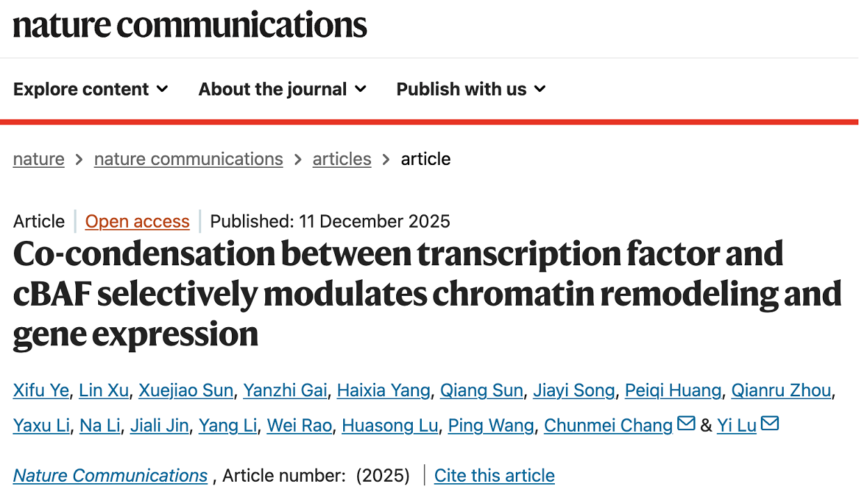 同济大学卢毅及其合作团队揭示转录因子与染色质重塑复合物通过共相分离精准协同调控基因转录,成果发表于《自然·通讯》