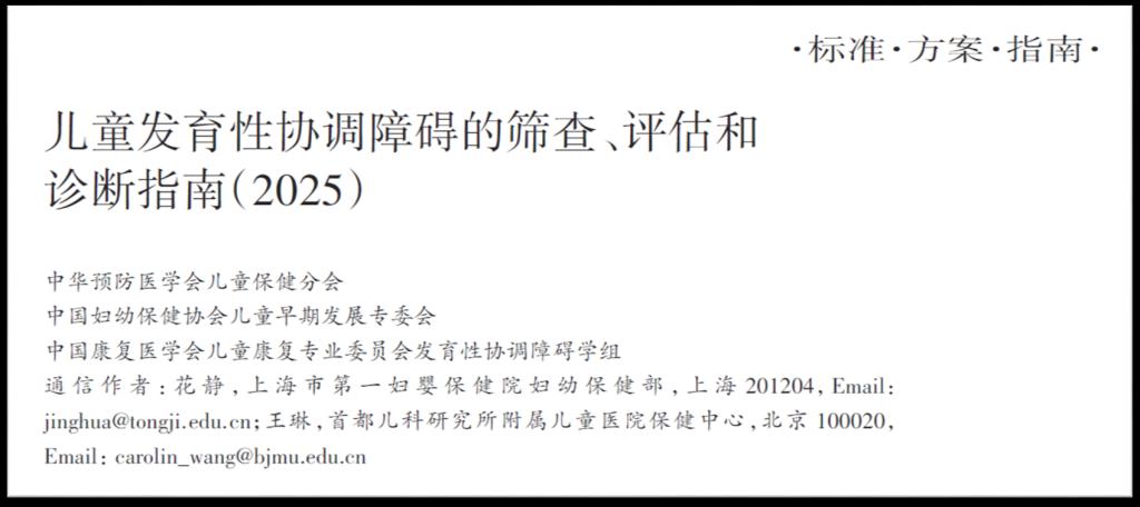 近日,由同济大学附属妇产科医院花静教授团队联合首都儿童医学中心组织制定的《儿童发育性协调障碍筛查、评估和诊断指南(2025)》(以下简称《指南》)在《中华儿科杂志》正式发表。该指南由中华预防医学会儿童保健分会、中国妇幼保健协会儿童早期发展专业委员会以及中国康复医学会儿童康复专业委员会发育性协调障碍学组联合发布,是我国首部针对儿童发育性协调障碍(Developmental Coordination Disorder,DCD)的规范性临床指南,标志着我国在儿童神经发育障碍领域的筛查、评估与诊断工作迈入标准化、规范化新阶段。