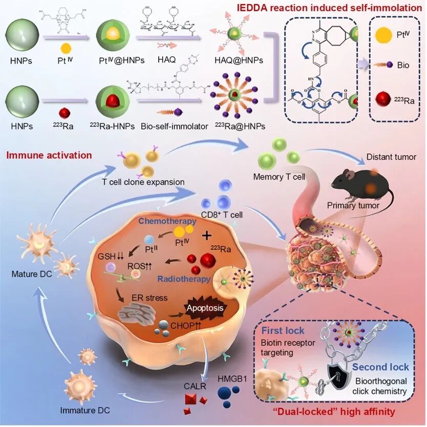 近日,同济大学核医学研究所余飞教授团队在《军事医学研究(英文)》(Military Medical Research)上发表题为“Dual-locked targeted alpha-emitter enhanced tumor immunotherapy via Diels–Alder reaction-based self-immolative molecular cage strategy”的论文。该研究利用逆电子需求狄尔斯-阿尔德(IEDDA)点击化学反应驱动的自裂解分子笼策略,实现223Ra肿瘤部位特异性“解锁”,并从内质网应激—免疫原性细胞死亡(ICD)—免疫检查点调控的路径解析其α辐射免疫效应,同时建立了初步剂量学框架,为新一代靶向α核药的设计与评价提供了可参考的技术路径。