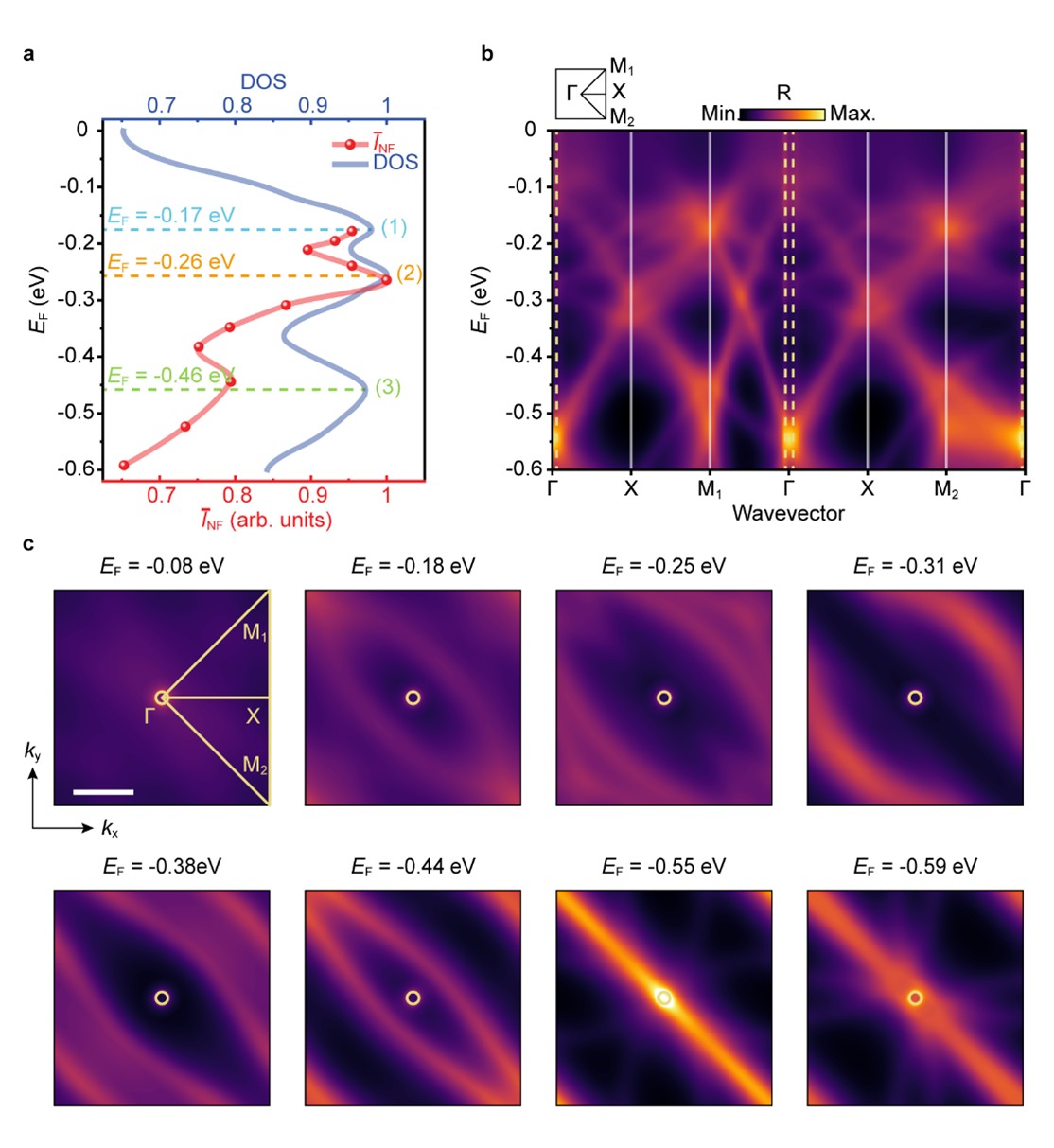 为解决这一难题,同济大学物理科学与工程学院王占山和程鑫彬团队的江涛教授,联合美国纽约城市大学Andrea Alù教授、中南大学倪祥教授、韩国浦项科技大学Kyoung-Duck Park教授,设计并制备了α-MoO3极化激元晶体与石墨烯的异质结电学器件。该结构巧妙结合了二维范德华材料α-MoO3所具有的低损耗、各向异性声子极化激元特性,以及石墨烯优异的电学可调性,实现了对光传播行为的主动调控。团队首先在α-MoO3上刻蚀出周期性纳米孔阵列,形成声子极化激元晶体,再与单层石墨烯堆叠形成异质结。通过施加背栅电压调控石墨烯的载流子浓度,即可改变其费米能级(EF)与光学性质,从而连续、动态地调制整个异质结构的光学行为。1月3日,相关研究成果以“Dynamic tuning of Bloch modes in anisotropic phonon polaritonic crystals”为题,发表于光学领域知名期刊《光:科学与应用》(Light: Science & Applications)。