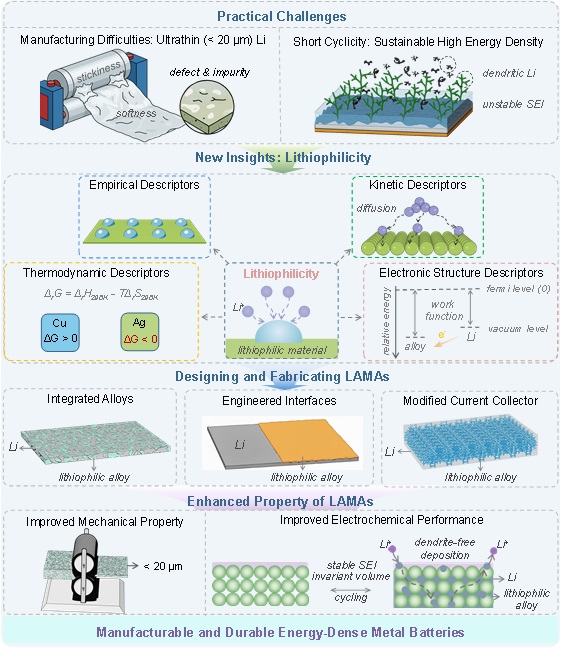 金属锂负极因其超高理论比容量(3860 mAh g⁻1)被广泛认为是下一代高比能电池的理想负极材料。然而,金属锂在实际应用中仍受制于制造性不足和循环稳定性差等关键瓶颈。近年来,亲锂合金金属负极(代称LAMA)通过引入锂-合金化金属及其衍生物,在调控锂成核与沉积行为方面展现出显著优势,可有效降低成核过电位、抑制枝晶生长,并显著提升负极的机械性能和可制造性,逐渐被视为实现实用化金属电池的极具潜力的解决方案。然而,亲锂性的本质内涵及亲锂材料在实用性LAMA中的作用机理仍缺乏系统认识。鉴于此,基于课题组前期工作及相关领域最新进展,同济大学沈力研究员、张弛教授课题组在《先进材料》(Advanced Materials)上发表了题为“Understanding and Designing Lithiophilic Alloyed Metal Anodes for Practical Metal Batteries”的综述性文章。