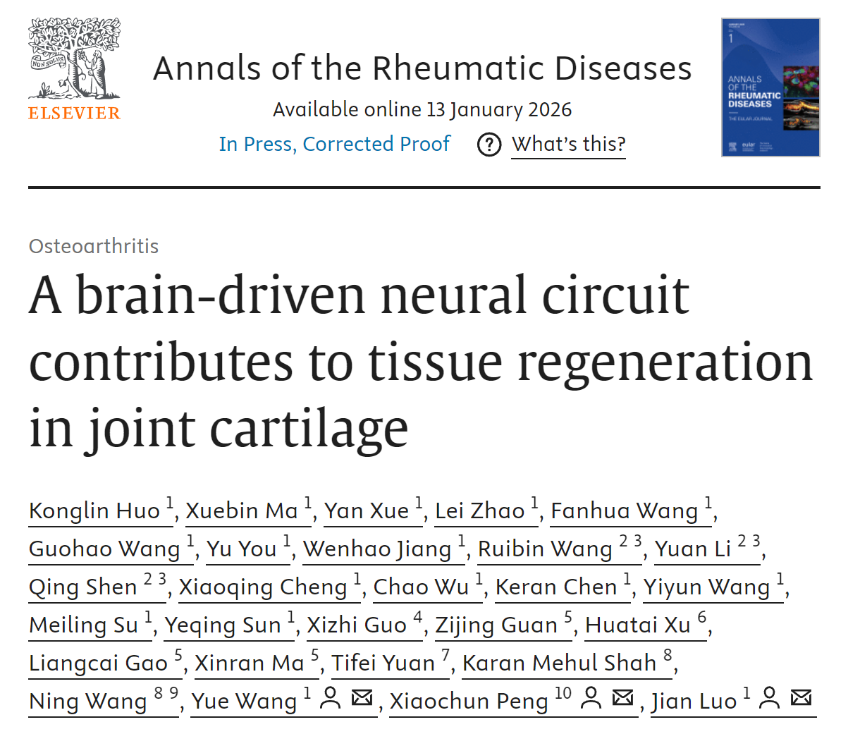 1月13日,同济大学医学院、同济大学附属养志康复医院(上海市阳光康复中心)罗剑教授团队,在《风湿病年鉴》(Ann Rheum Dis)在线发表了题为“A brain-driven neural circuit contributes to tissue regeneration in joint cartilage”的研究成果。该研究以关节软骨为例,首次证实,大脑在调控组织器官再生中具有至关重要的作用。通过精准干预大脑及其下游神经环路,可让原本几乎无再生能力的软骨组织重获再生能力,且新生软骨的形态结构、分子标志物表达及力学性能均与天然透明软骨高度一致。