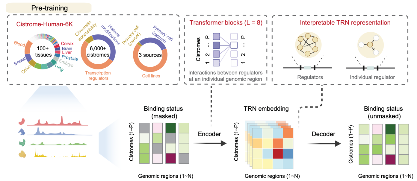 转录调控因子、顺式调控元件与靶基因之间的相互作用共同构成转录调控网络,并在很大程度上决定细胞类型特异的基因表达程序。理解转录调控因子如何在特定基因组区域协同作用,以及这种调控结构如何随细胞类型、发育阶段或外界刺激而变化,是解析基因表达调控机制的关键问题。ENCODE等计划已积累了大量转录调控相关组学数据,但迄今为止,在“转录调控因子×细胞类型”这一组合空间上的数据覆盖度仍然极低,导致多数细胞语境下的转录调控规律缺乏直接数据证据。近年来,预训练基础模型在基因组学任务中显示出良好的表征学习能力:通过在大规模数据上进行预训练学习通用特征,再通过微调适配特定任务,有望在一定程度上缓解数据稀缺与跨细胞状态泛化的挑战。