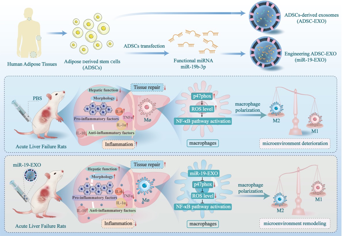 近日,同济大学医学院干细胞研究中心、附属东方医院徐俊教授团队,在《今日材料生物》(Materials Today Bio)上发表了题为“miR-19b-3p engineered adipose-derived stem cell exosomes attenuate acute liver failure via promoting tissue repair and microenvironment remodeling”的研究成果。该研究首次构建了过表达miR-19b-3p的人脂肪干细胞来源的外泌体(miR-19-EXO),在急性肝衰竭(ALF)大鼠模型中,将ALF大鼠的24小时生存率从25%显著提升至75%,并同步实现肝组织损伤修复与免疫微环境重塑。