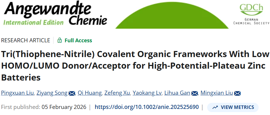 化学科学与工程学院甘礼华、刘明贤团队设计三噻吩-三氰基共价有机框架构筑高电压平台锌-有机电池电池,成果发表于《德国应用化学》